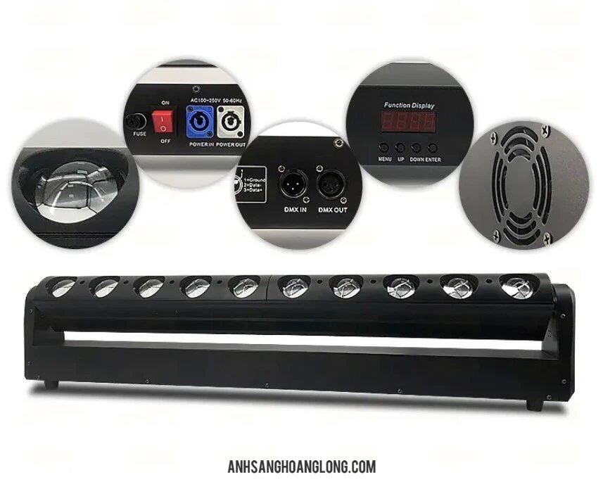 Điện áp : AC100-240V,50-60Hz; Chống nước : IP20; Đèn moving bar gồm 10 đèn moving led mini full color RGBW được trải đều trên cùng một thanh bar. Tuổi thọ bóng đèn sử dụng lên tới 50,000h. Góc chùm tia đèn hẹp nhất từ 2 độ;