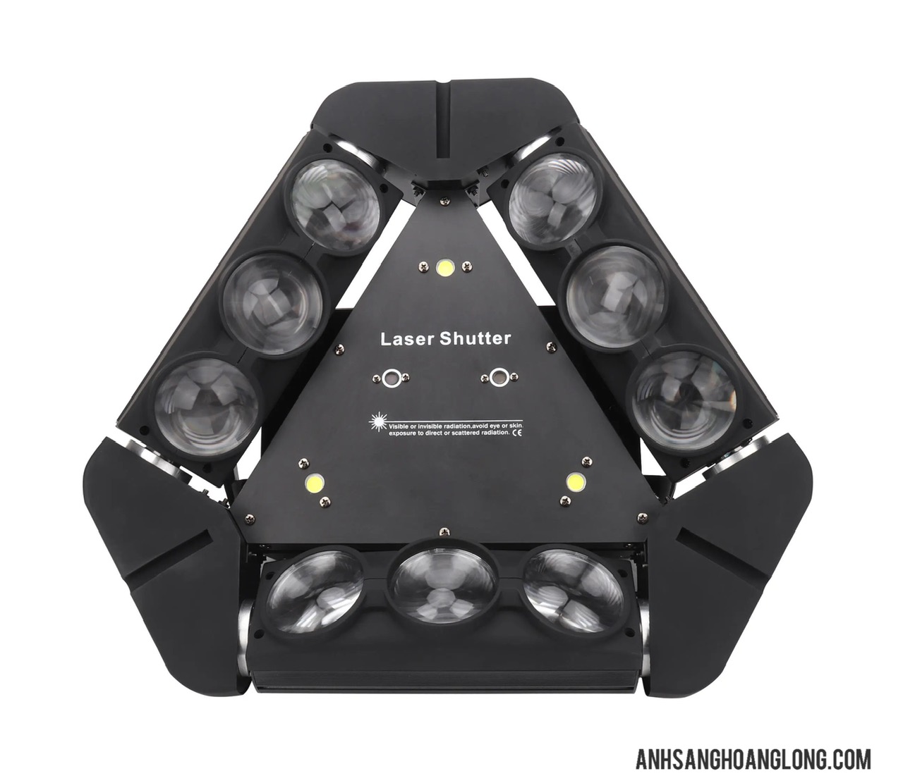 Moving nhện 9 mắt có laser. Thông số cơ bản: Kết hợp 3 nguồn sáng đó là 9 bóng led đổi màu mỗi bóng có công suất 10w tiếp đến là 3 bóng chớp trắng và cuối cùng là 2 mắt laser xanh lá và đỏ; độ bao phủ ánh sáng rộng và mạnh, các luồng sáng rõ nét và to. ..