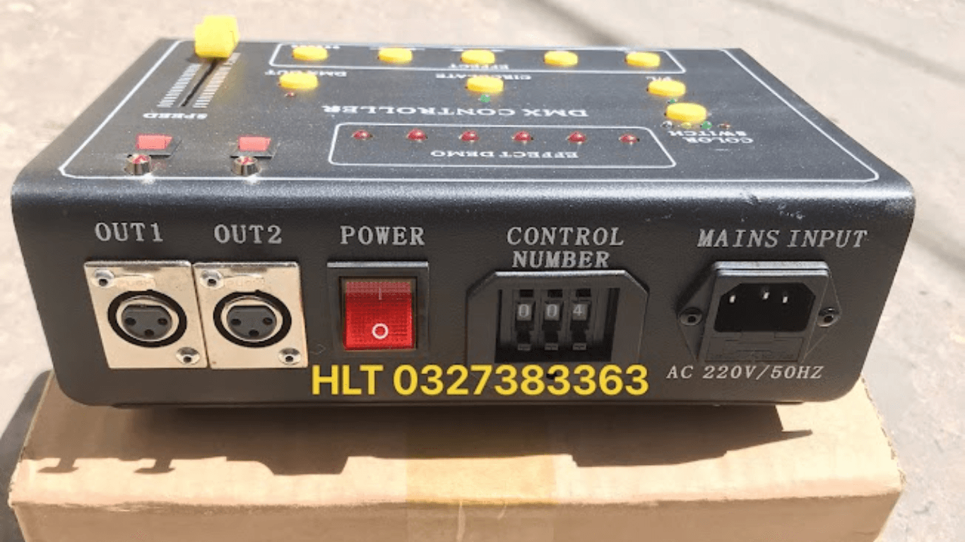 - Phía sau của bàn điều khiển dmx DIP là 2 đường canon outi1 và outi2. Đây là 2 đường canon tích hợp sẫn để cắp tín hiệu từ các máy TẠO LỨA SÂN KHẤU kết nối vào với bàn để thông tín hiệu. Và mỗi một đường canon outi là một đường riêng biệt mà ta muốn kết nối chia máy;