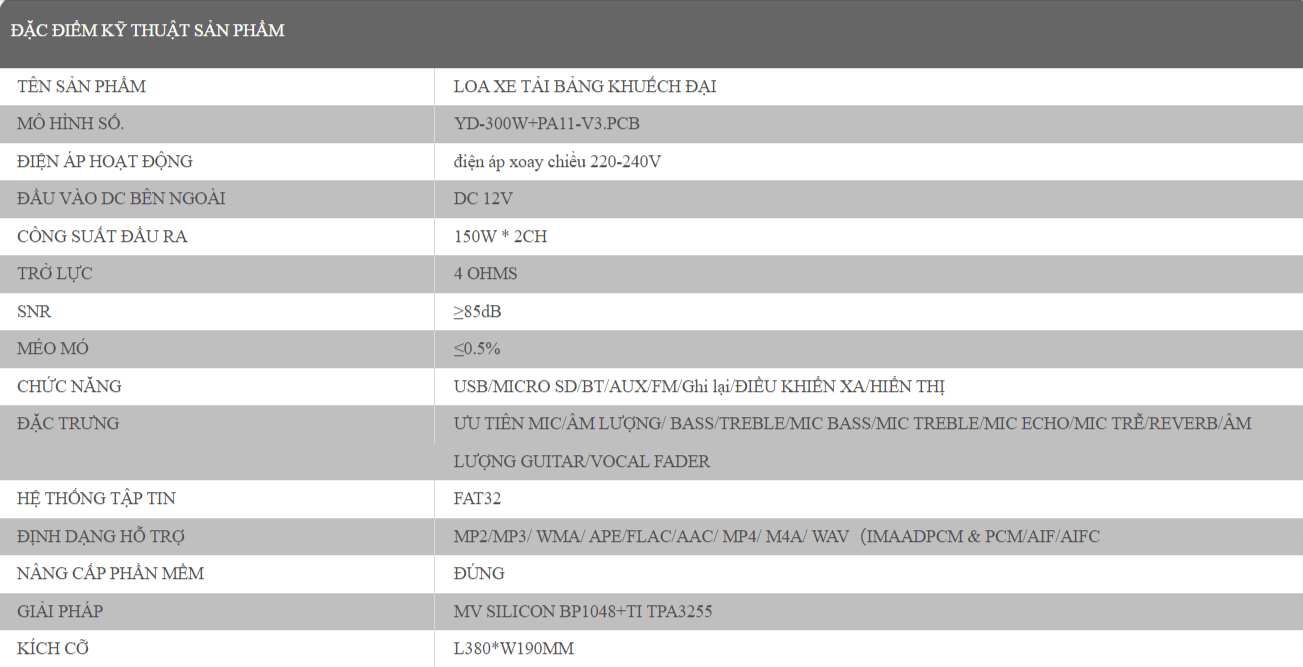 Mạch công xuất loa kéo mã : YD-300W+PA11-V3.PCB được phân phối bởi Ánh Sáng Hoàng Long có đặc điểm kỹ thuật theo bảng sau: