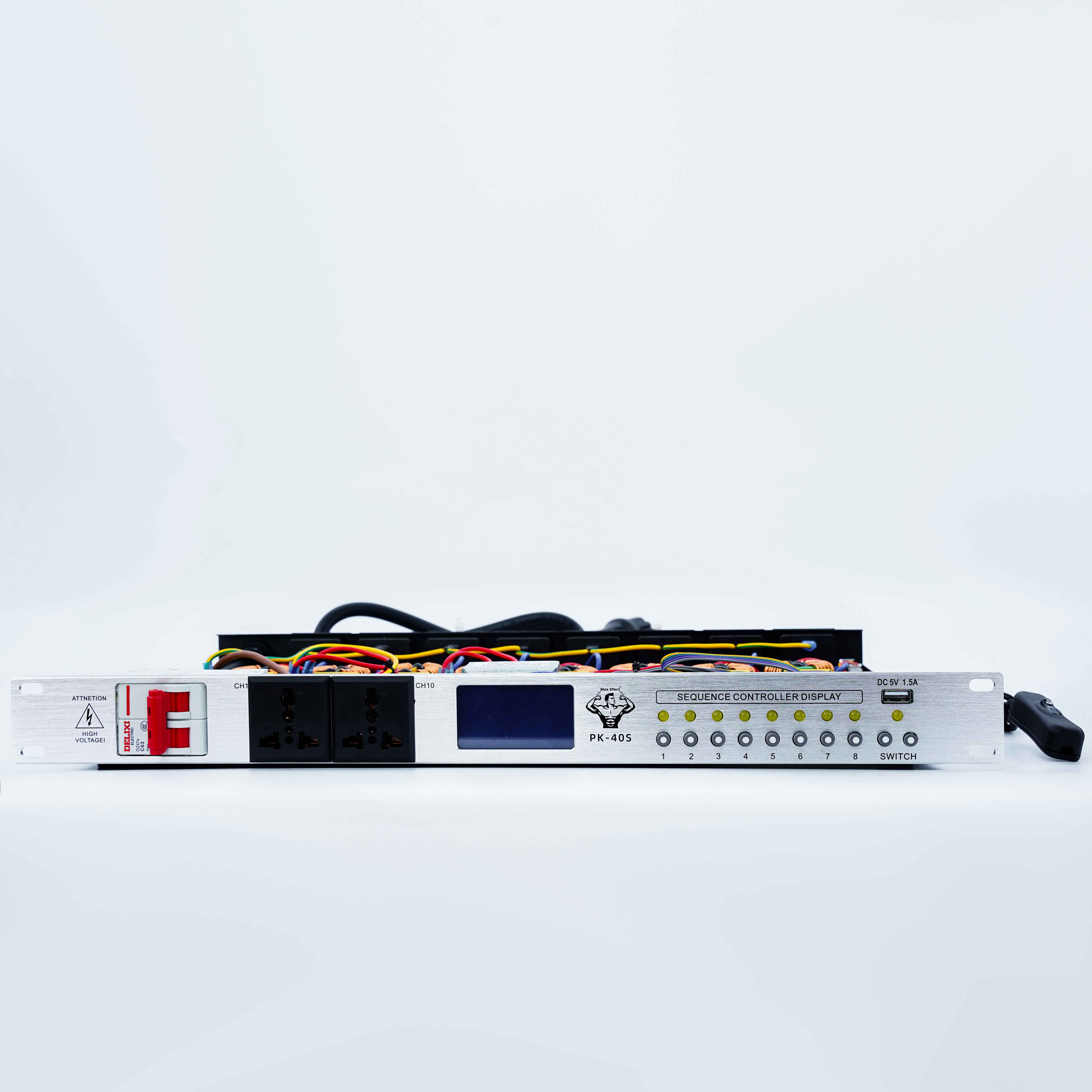 sản phẩm bộ chia nguồn Max effect PK40S 8 cổng cắm điện nguồn được bật theo thứ tự 1 -> 8 và khi tắt ngược lại theo thứ tự 8 -> 1 giúp các