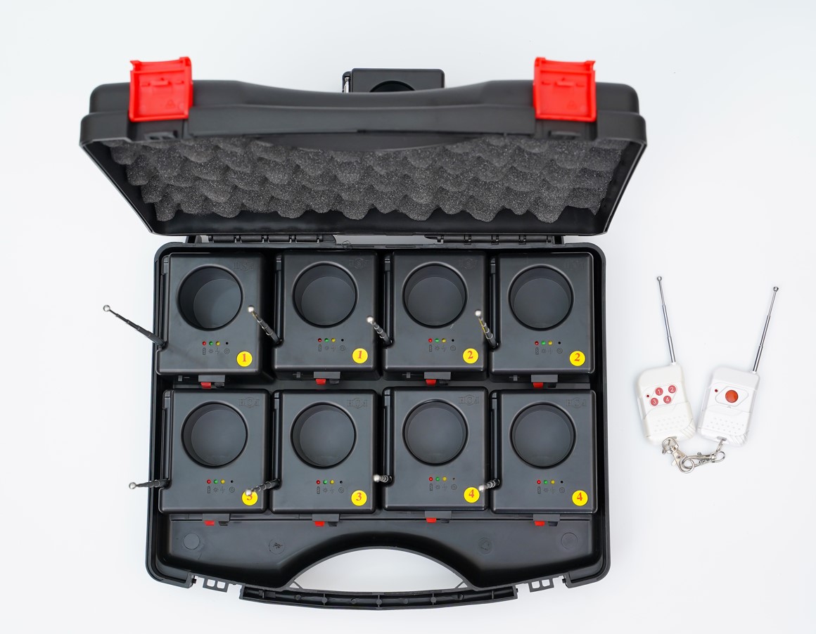 Đi kèm với bộ kích pháo điện là 1 hộp đựng đủ 8 đế và 1 điều khiển cho bộ kích pháo, vận chuyện rất dễ dàng và chống sốc mạnh.