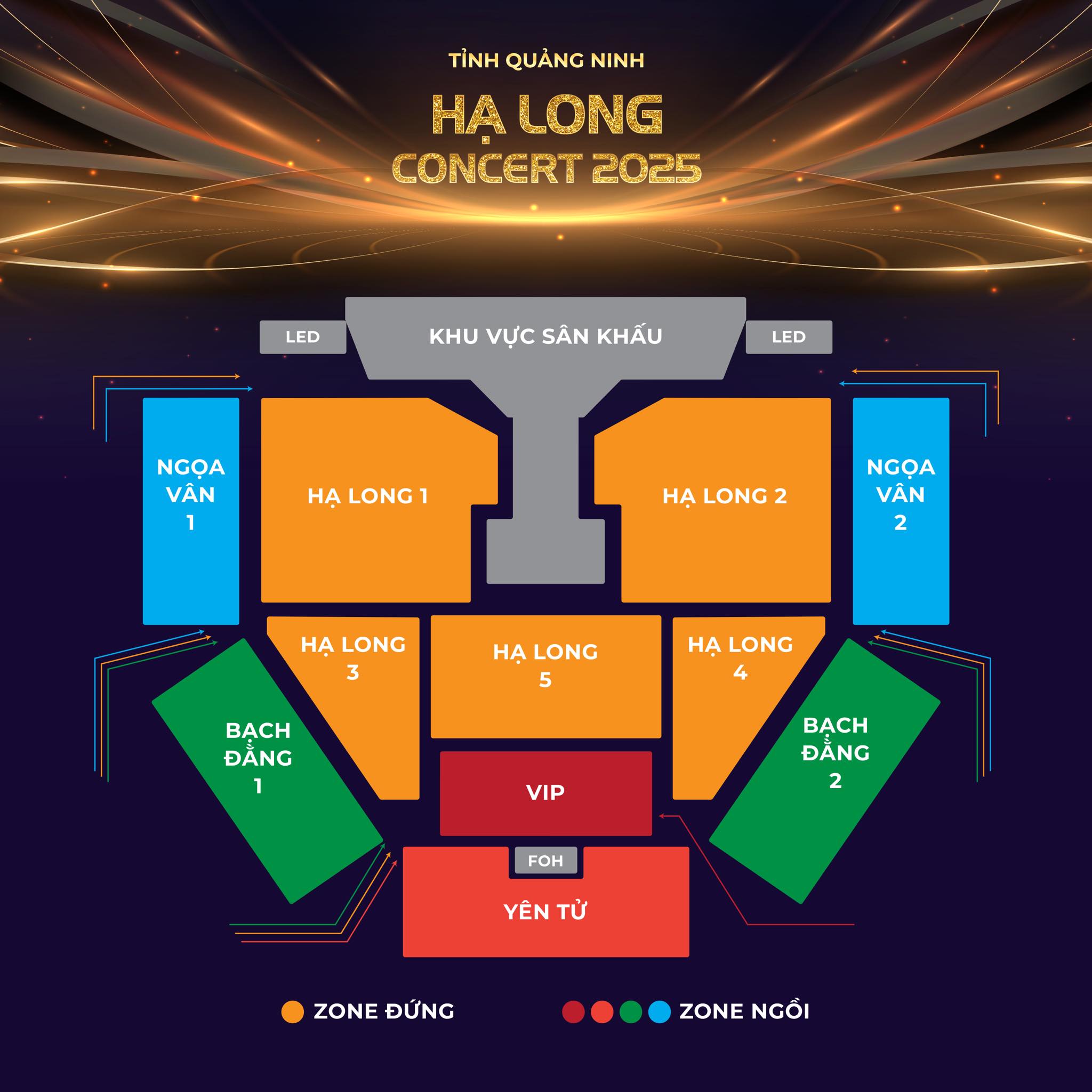 Khu vực khán đài được chia thành nhiều khu vực ngồi và đứng khác nhau (như các zone Hạ Long, Bạch Đằng, Yên Tử, Ngoạ Vân, và khu VIP) để đảm bảo trải nghiệm thưởng thức âm nhạc tốt nhất cho khán giả.