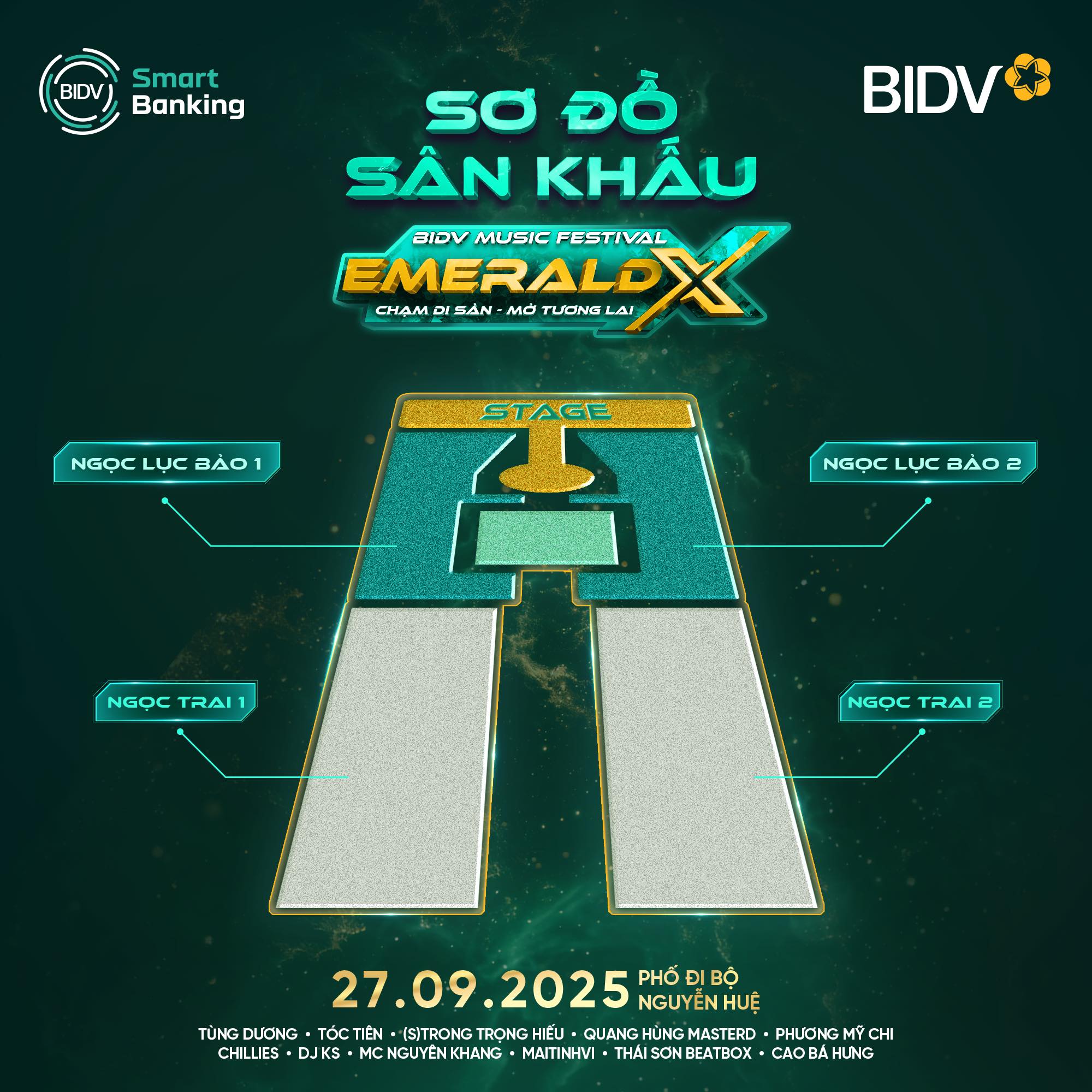 Đại nhạc hội BIDV Music Festival Emerald X với chủ đề "Chạm di sản - Mở tương lai" sẽ chính thức diễn ra vào ngày 27/09/2025 tại phố đi bộ Nguyễn Huệ, TP.HCM, quy tụ dàn nghệ sĩ hàng đầu Việt Nam. Sự kiện đánh dấu một thập kỷ tiên phong của ứng dụng ngân hàng số BIDV SmartBanking.