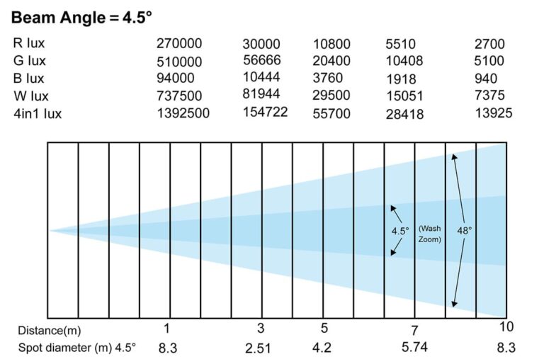 Zoom motorized từ 4.5° tia beam sắc nét đến 43° hiệu ứng wash phủ rộng.
