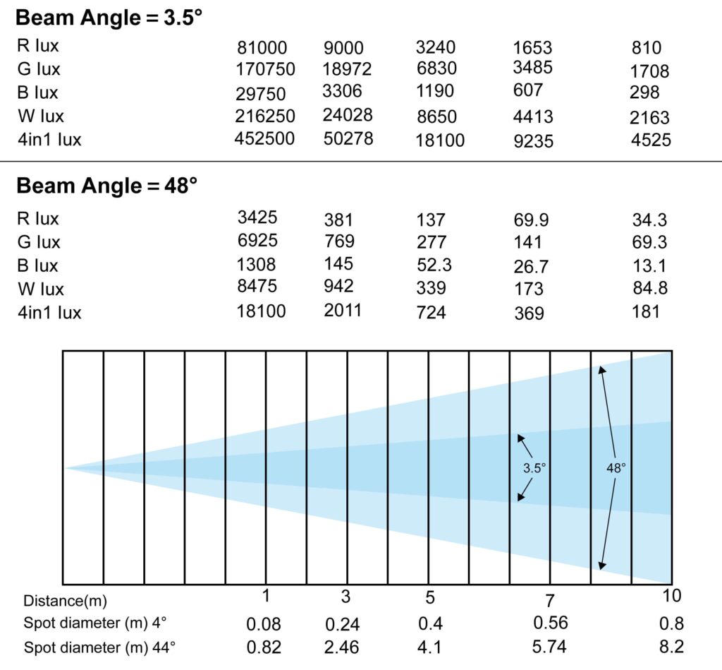 Zoom động 3.5°–48°, từ chùm tia sắc nét đến ánh wash đều mượt.