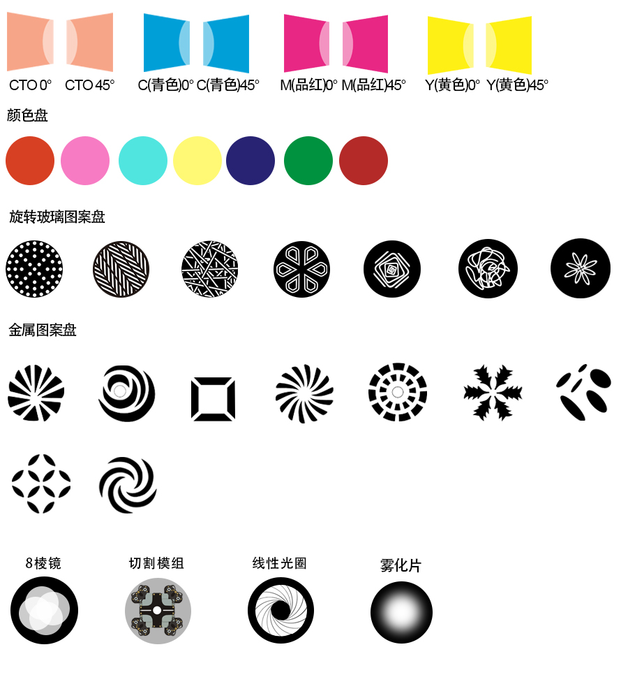 2 bánh xe gobo: 1 kính xoay + 1 kim loại
