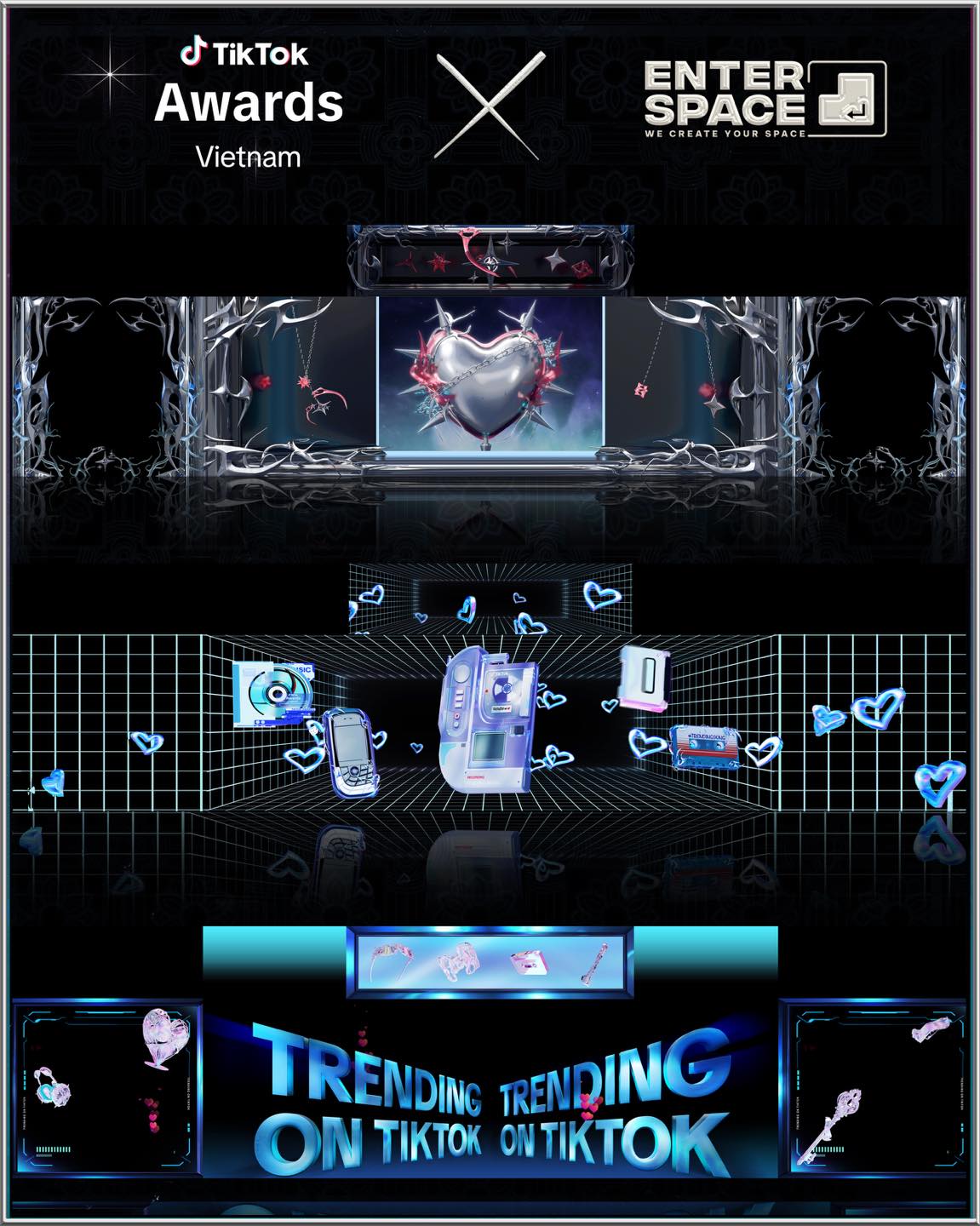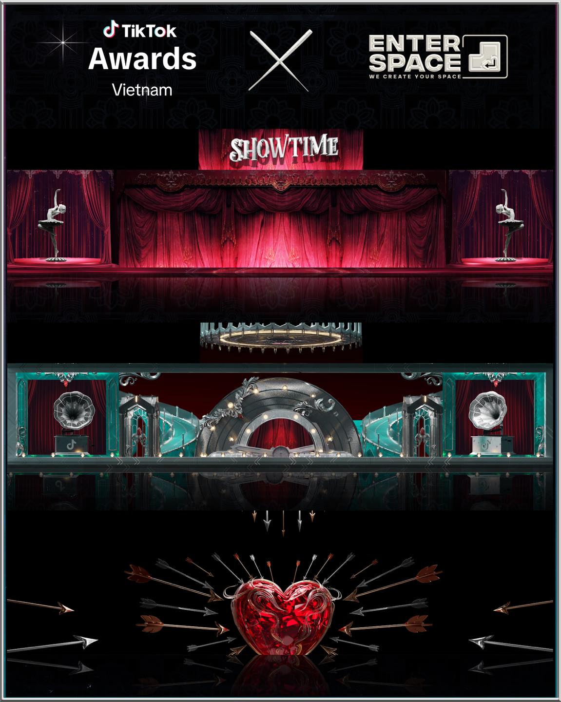 Điểm nhấn trung tâm là trái tim pha lê đỏ thẫm xuyên qua bởi những mũi tên, tượng trưng cho đam mê, nỗ lực và sự cống hiến của nghệ sĩ TikTok. Cách EnterSpace xử lý chất liệu ánh sáng - phản chiếu - chuyển cảnh tạo cảm giác sang trọng và lộng lẫy, đưa khán giả vào không khí của một buổi biểu diễn nghệ thuật đỉnh cao.
