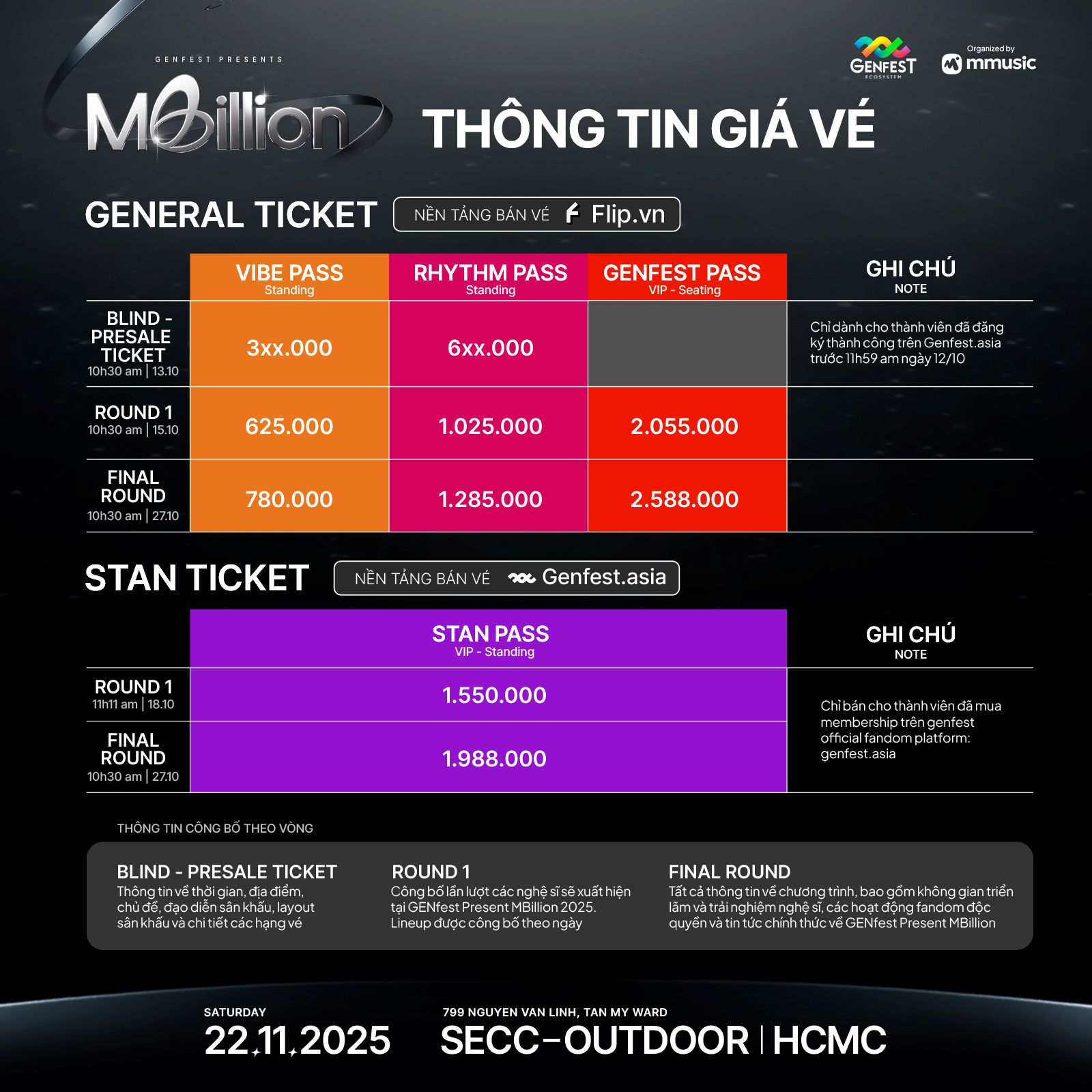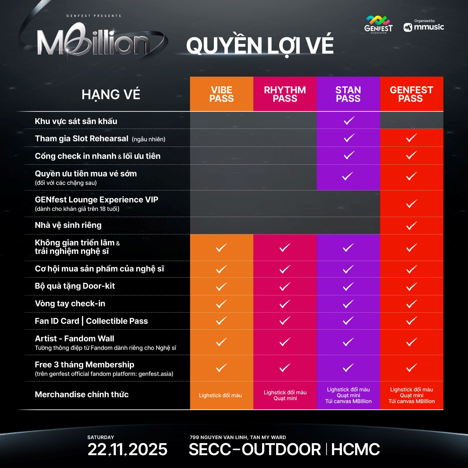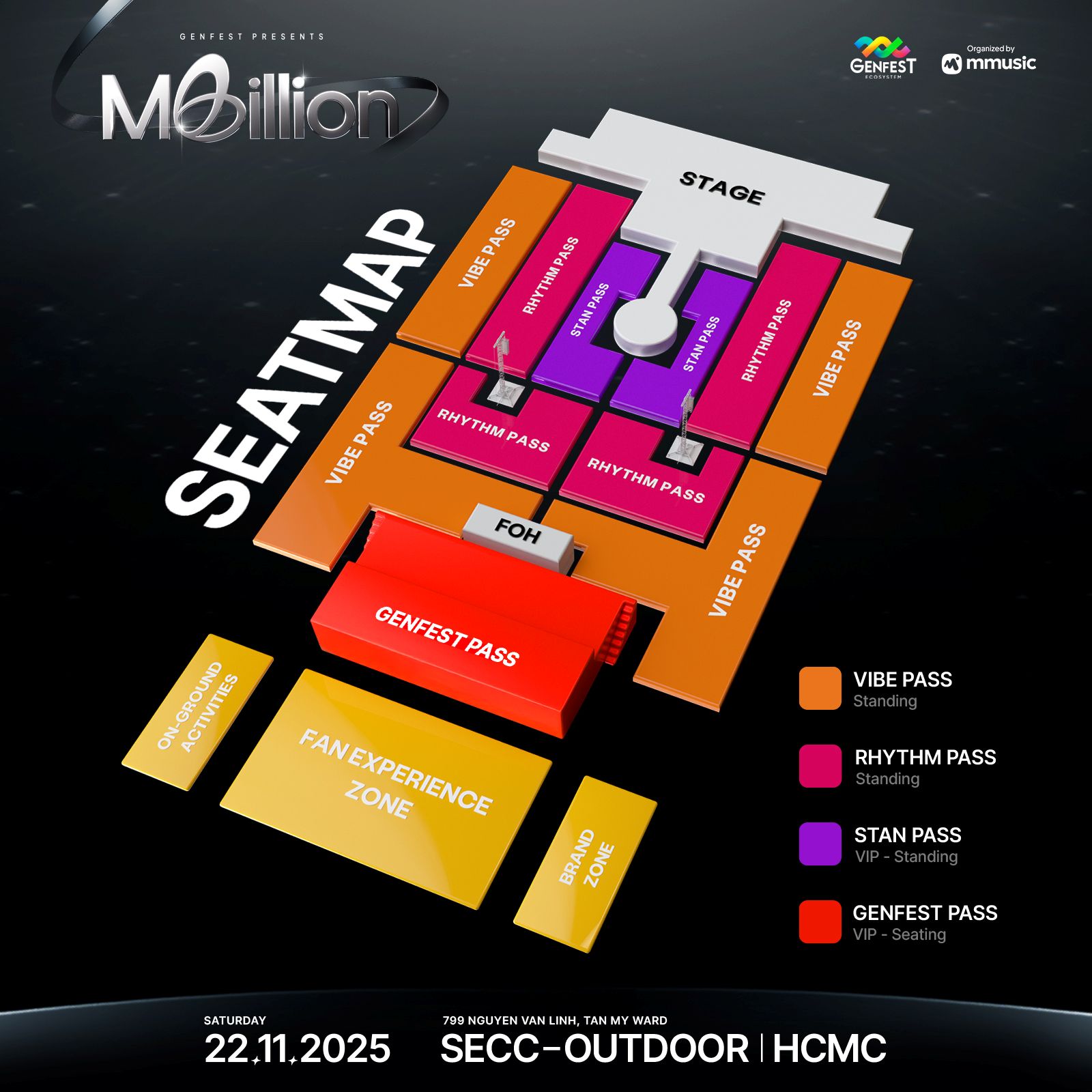 Ban tổ chức cũng đã chính thức công bố sơ đồ sân khấu (seatmap) và các quyền lợi chi tiết của từng hạng vé. Các hạng vé bao gồm Vibe Pass, Rhythm Pass, GENfest Pass và Stan Pass, mỗi hạng vé được thiết kế để mang đến những trải nghiệm riêng biệt, từ khu vực sôi động cho đến vị trí cận sân khấu dành cho các fandom cuồng nhiệt.