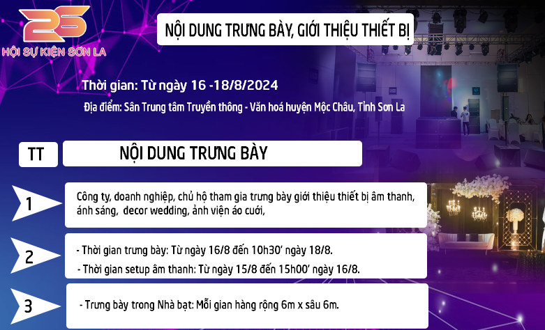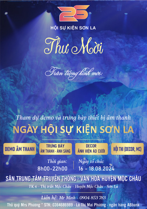 Hội Sự Kiện Sơn La là một sự kiện nổi bật trong ngành công nghiệp giải trí, được tổ chức tại SÂN TRUNG TÂM TRUYỀN THÔNG - VĂN HOÁ HUYỆN MỘC CHÂU, Sự kiện này thu hút hàng chục doanh nghiệp và hàng ngàn khách tham quan, trở thành điểm hẹn không thể thiếu cho những người đam mê công nghệ ánh sáng và âm thanh.