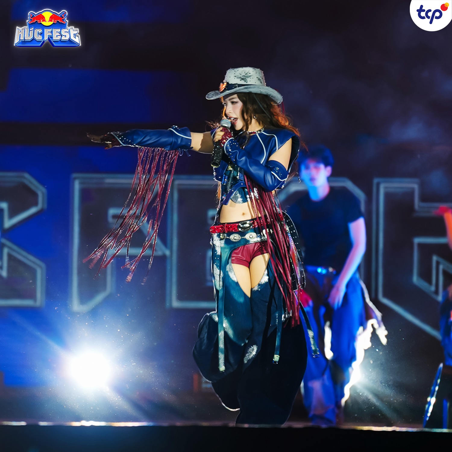 Từ chiếc nón cao bồi, áo croptop đến quần ống rộng kết hợp tua rua và boots cao, tất cả đã tạo nên một tổng thể ấn tượng, hoàn toàn phù hợp với tinh thần bùng nổ của Red Bull Húc Fest.