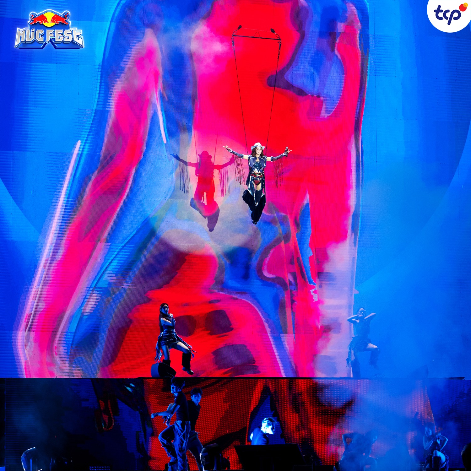 Các dàn nâng cơ khí cũng được sử dụng hiệu quả, từ việc đưa HURRYKNG lên cao giữa "bầu trời sao" cho đến việc hỗ trợ màn đu dây "hạ cánh" từ không trung của Chi Pu, tất cả đều tạo ra những khoảnh khắc đầy kịch tính.