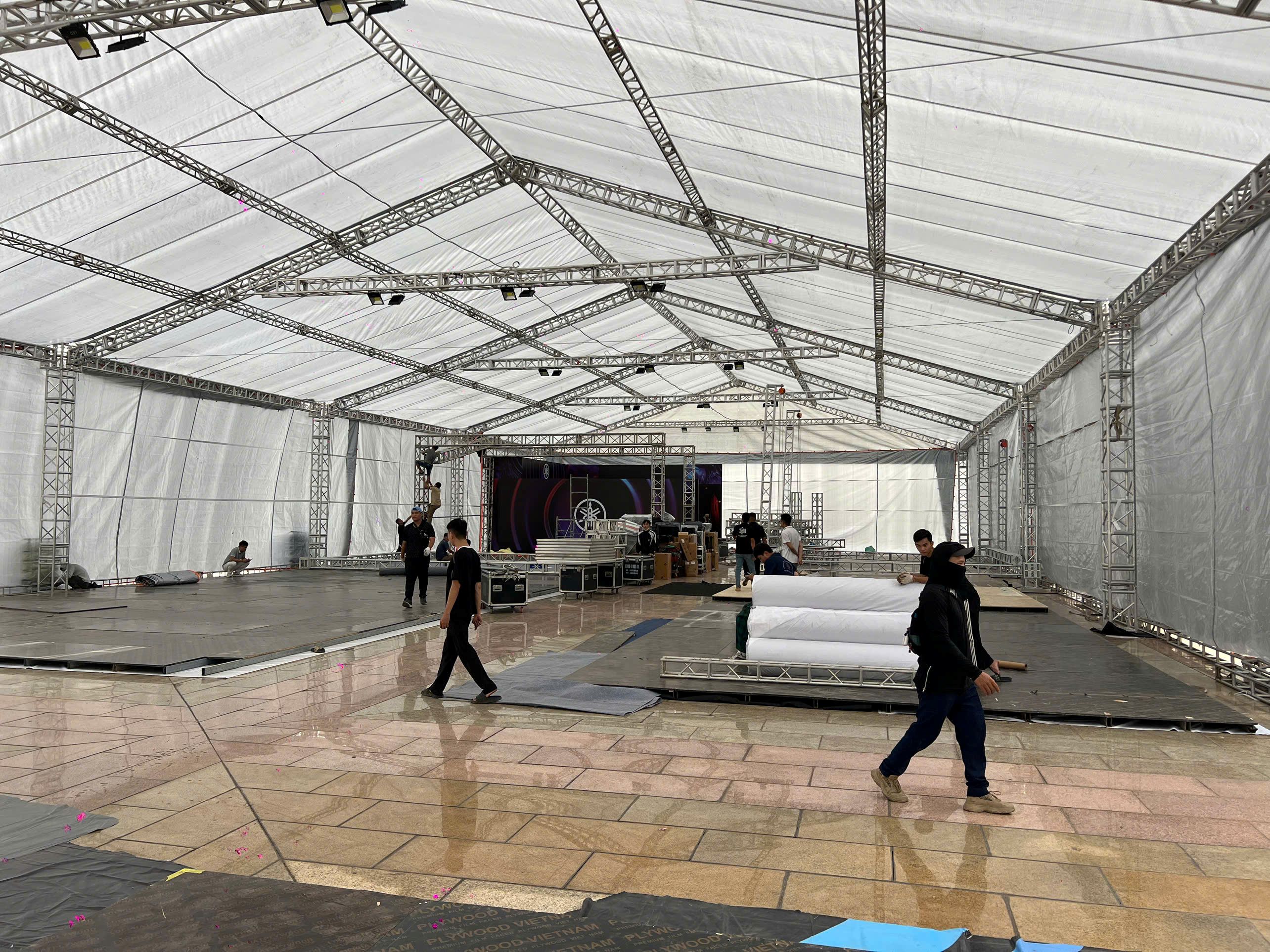 Những hình ảnh cập nhật tiến độ mới nhất từ Trung tâm Hội nghị Quốc gia cho thấy một "đại công trường" đang hoạt động hết công suất. Đội ngũ kỹ thuật của Ánh Sáng Hoàng Long đang tỉ mỉ lắp ráp hệ thống khung truss, treo đèn và bố trí các thiết bị hiệu ứng.