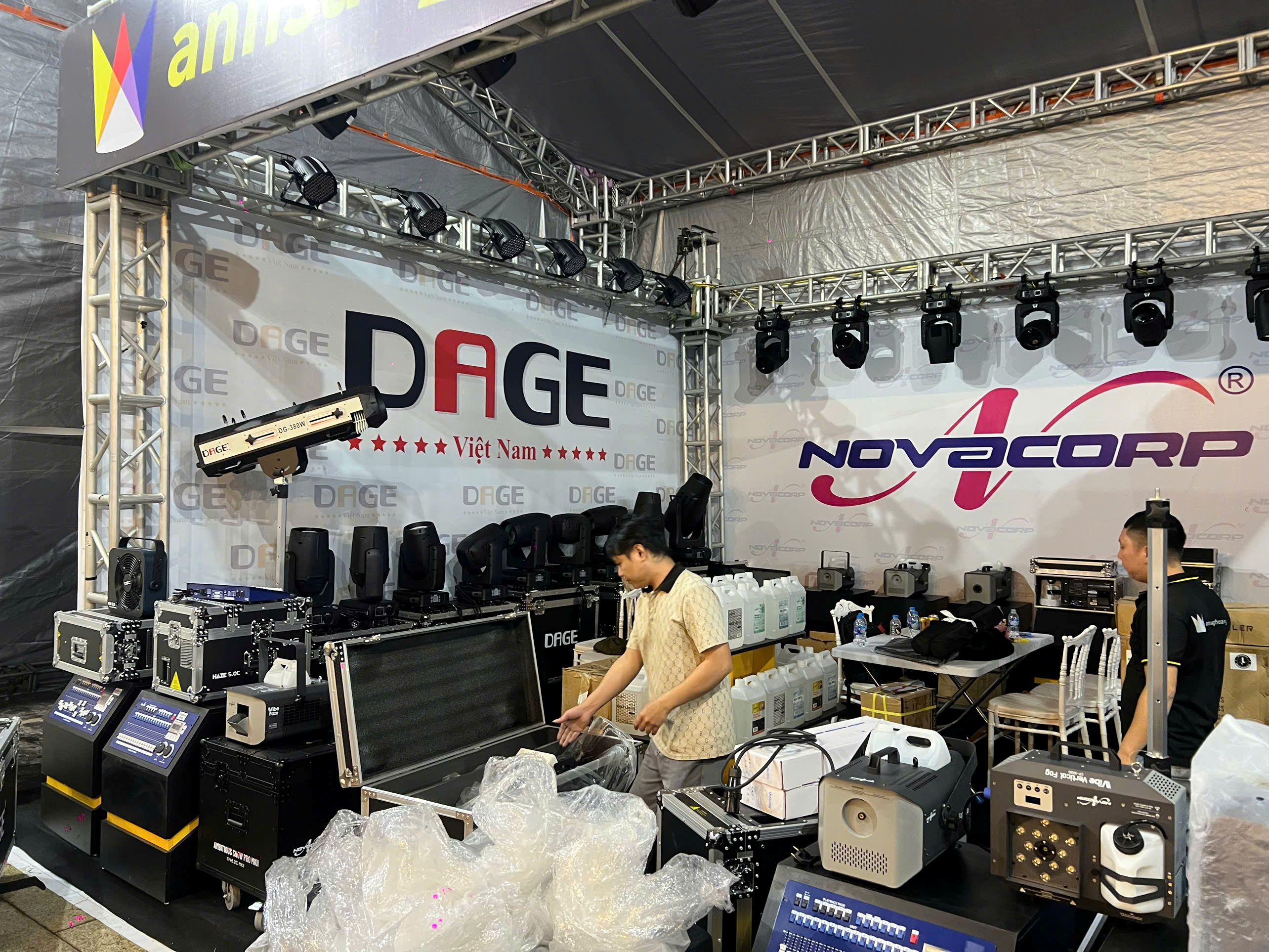 Hàng loạt thiết bị "khủng" từ DAGE, Novacorp, BO Lighting đã được tập kết. Hình ảnh các kỹ thuật viên đang khẩn trương unbox và lắp đặt cho thấy sự chuẩn bị vô cùng kỹ lưỡng.