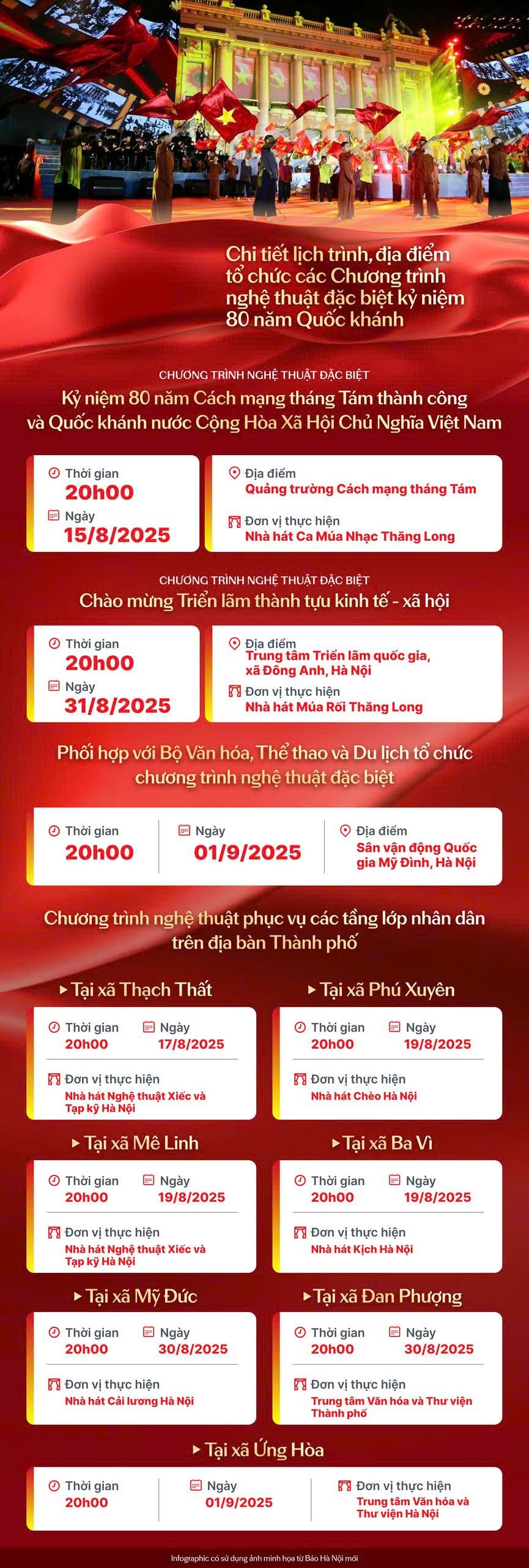 Nhân dịp kỷ niệm 80 năm Cách mạng Tháng Tám và Quốc khánh 2/9, Thủ đô Hà Nội sẽ là nơi diễn ra chuỗi hoạt động và chương trình nghệ thuật đặc sắc kéo dài từ giữa tháng 8. Tâm điểm của chuỗi sự kiện này là chương trình nghệ thuật lớn mang tên "80 năm - Tự hào Việt Nam", được tổ chức tại khu vực Hồ Hoàn Kiếm từ ngày 30/8 đến 2/9/2025.