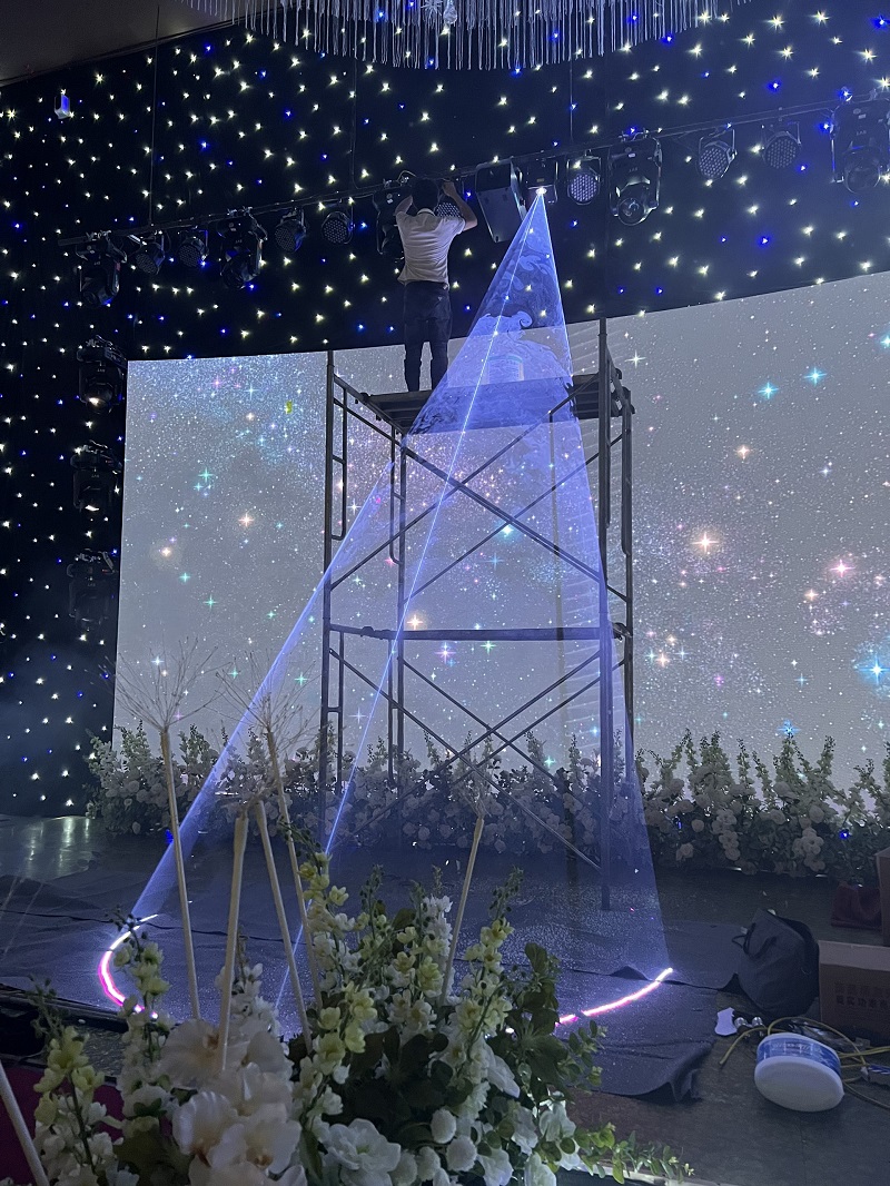 Hiệu ứng ánh sáng độc đáo: đèn Laser tại Ánh Sáng Hoàng Long có khả năng tạo ra những dải ánh sáng sắc nét và đầy màu sắc, mang đến những hiệu ứng ánh sáng lung linh, huyền ảo cho không gian cưới