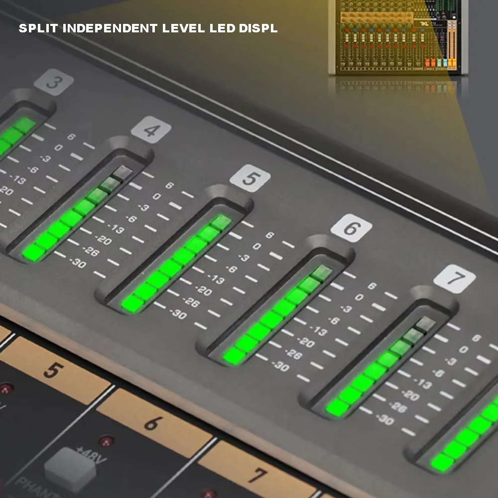 100 fader siêu mượt MM; Chức năng soundcard tích hợp để kết nối với PC hoặc ĐIỆN THOẠI; Máy nghe nhạc MP3 có Bluetooth, chức năng ghi âm, EQ và Điều khiển khuếch đại; Màn hình ma trận điểm 2,5 inch; Dual 7 băng tần EQ trên đầu ra âm thanh nổi chính; Đầu ra âm thanh nổi và bốn đầu ra nhóm.