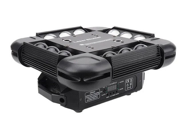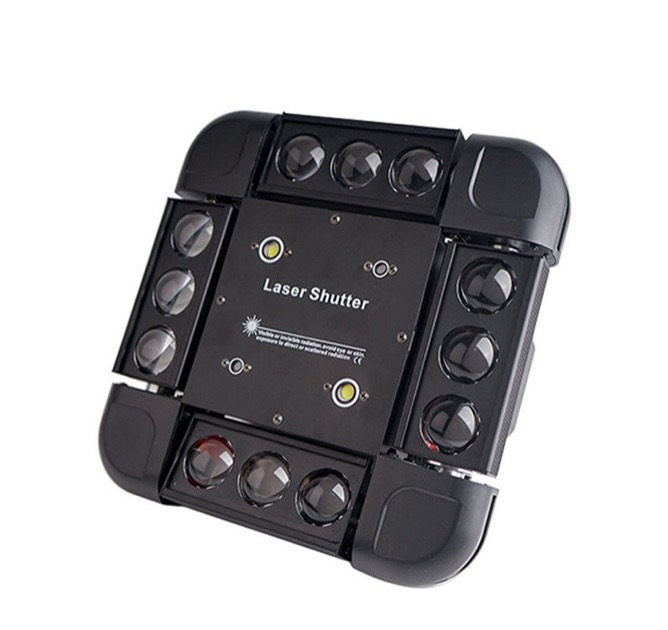 Đèn moving 12 Mắt x 10w Vuông sử dung 3 nguồn sáng chính sau: 12 bóng led đổi màu mỗi bóng có công suất 10w, 2 bóng chớp trắng mỗi bóng có công suất 20w, 2 bóng laser xanh lá và đỏ tổng công suất laser 200mw.