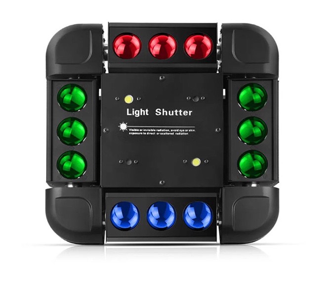 Đèn moving 12 Mắt x 10w Vuông dùng 2 bóng laser xanh đỏ có công xuất lên đến 500 mw cho ra ánh sáng mạnh, bao phủ khắp không gian rộng . Đèn có chế độ chạy tự động và cảm ứng theo tiếng nhạc , có thể chạy nhiều đèn cùng lúc qua bàn điều khiển DMX.