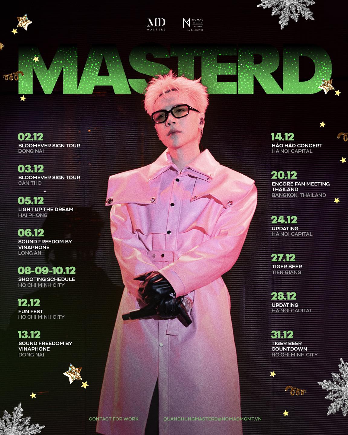 Khán giả sẽ được chứng kiến khả năng khuấy động sân khấu của anh tại hai sự kiện lớn là Fun Fest (12/12, TP.HCM) và tiếp tục Đại nhạc hội Sound Freedom tại Đồng Nai (13/12).