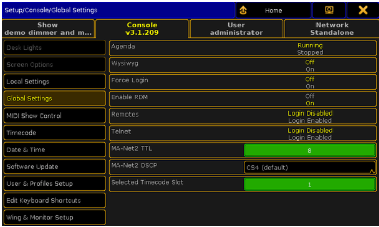 Nhấn Setup, sau đó chọn Console > Global Settings.