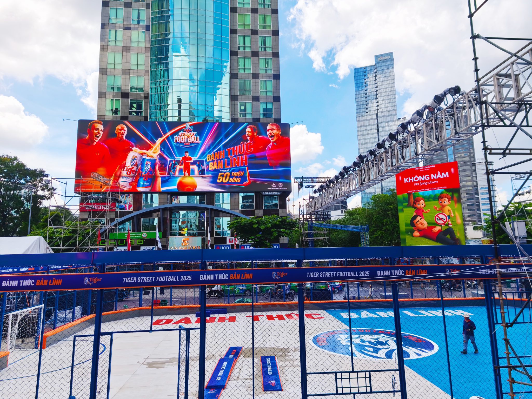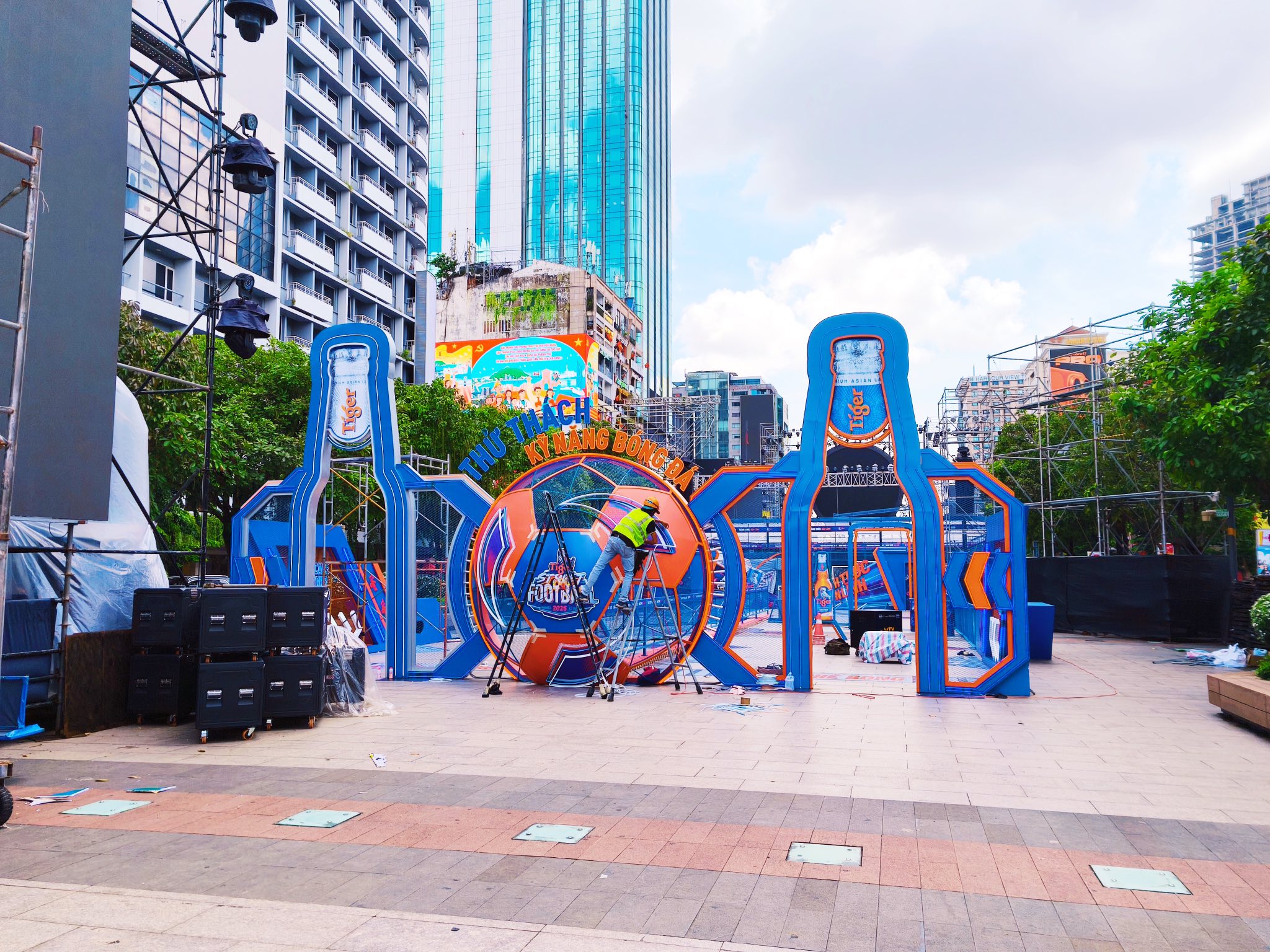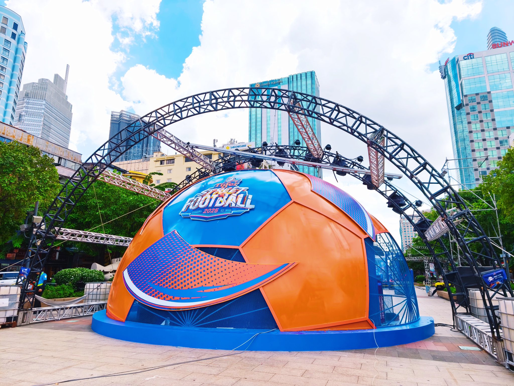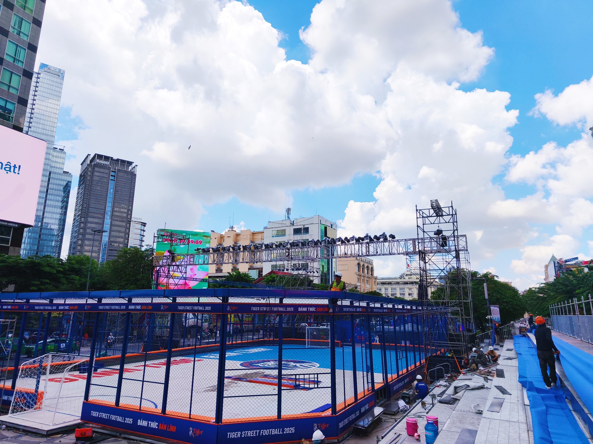Theo ghi nhận thực tế, Phố đi bộ Nguyễn Huệ những ngày này đã khoác lên mình một diện mạo hoàn toàn mới. Một sân khấu chính quy mô lớn cùng hệ thống giàn giáo, âm thanh, ánh sáng hiện đại đang được lắp đặt, cho thấy sự đầu tư nghiêm túc của ban tổ chức. Tâm điểm của khu vực là một sân bóng đá đường phố mini được thiết kế chuyên nghiệp, sẵn sàng cho những trận cầu nảy lửa.
