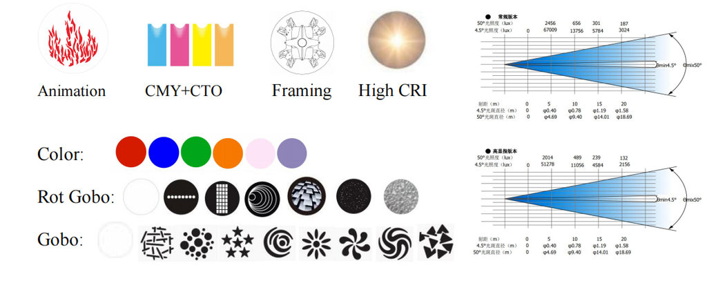- 1 bánh xe gobo cố định: 8 bộ lọc mẫu + trắng, 1 bánh xe gobo xoay: 6 gobo + trắng.