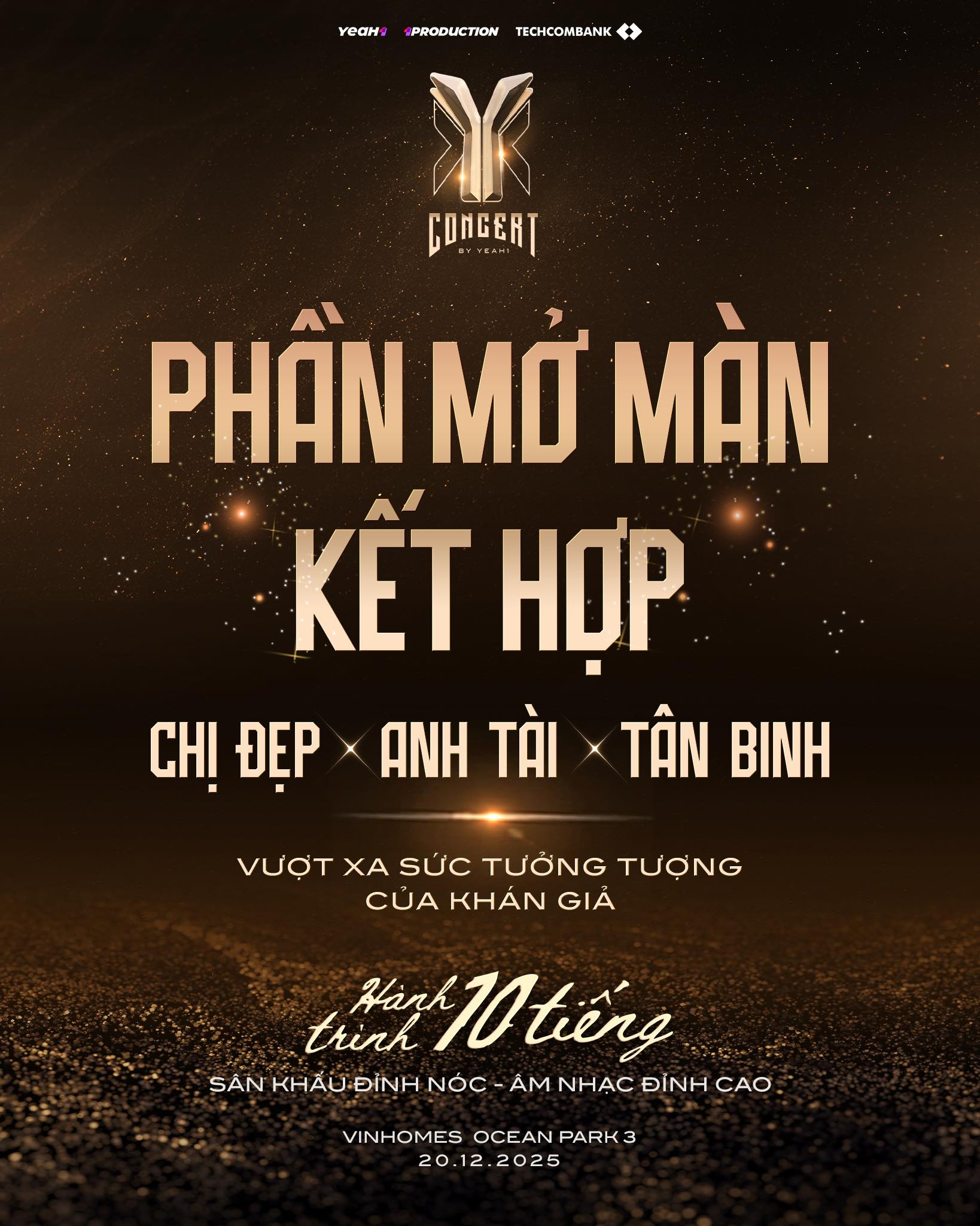 Làng giải trí Việt Nam nửa cuối năm 2025 sắp sửa chứng kiến một "cơn địa chấn" thực sự, một sự kiện âm nhạc với quy mô chưa từng có, mang tên Y-CONCERT 2025. Được tổ chức bởi YeaH1, đây không chỉ là một buổi hòa nhạc, mà là một festival âm nhạc kéo dài 10 tiếng liên tục, quy tụ 55 nghệ sĩ hàng đầu từ 4 chương trình truyền hình thực tế đình đám nhất. Vào ngày 20.12.2025, tại "thành phố điểm đến" Vinhomes Ocean Park 3, hàng chục ngàn trái tim yêu nhạc sẽ cùng nhau sống trọn vẹn trong một "hành trình 10 tiếng" của đam mê, cảm xúc và những sân khấu đỉnh cao.