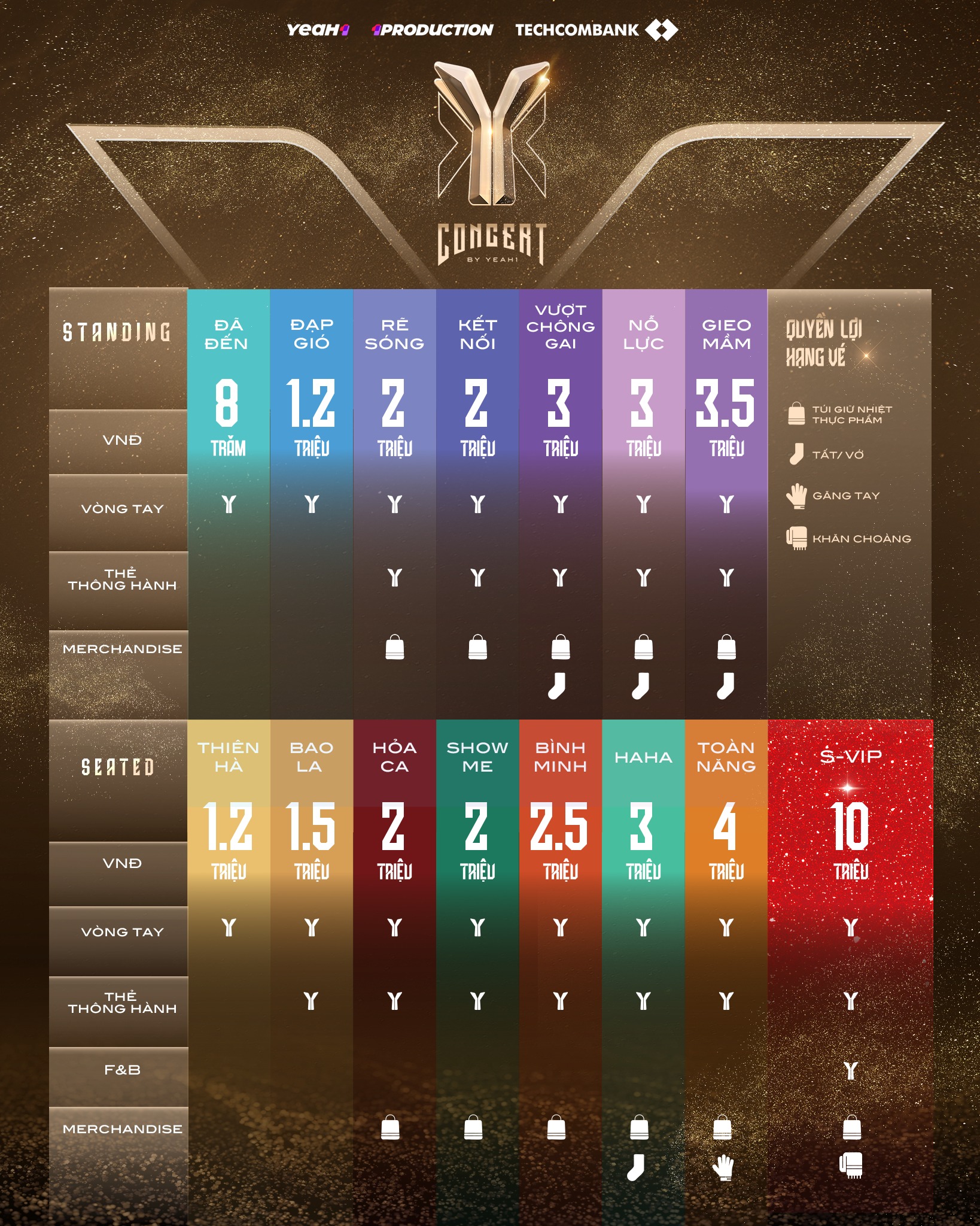 Sơ đồ chỗ ngồi (Set map) và các hạng vé (Quyền lợi) cũng đã được công bố, với nhiều khu vực từ Standing, Seated đến S-VIP, đáp ứng mọi nhu cầu của khán giả (như hình ảnh đính kèm).