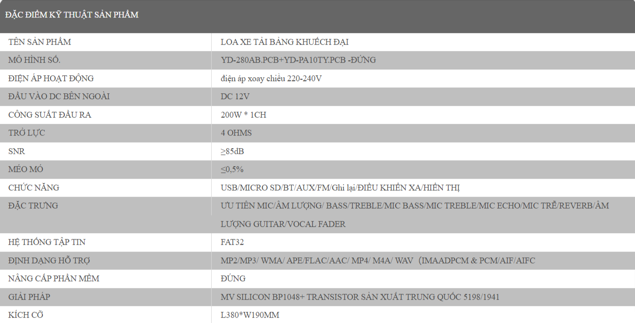 Mạch công xuất loa kéo mã : YD-280AB.PCB+YD-PA10TY.PCB được phân phối bởi Ánh Sáng Hoàng Long có đặc điểm kỹ thuật theo bảng sau: