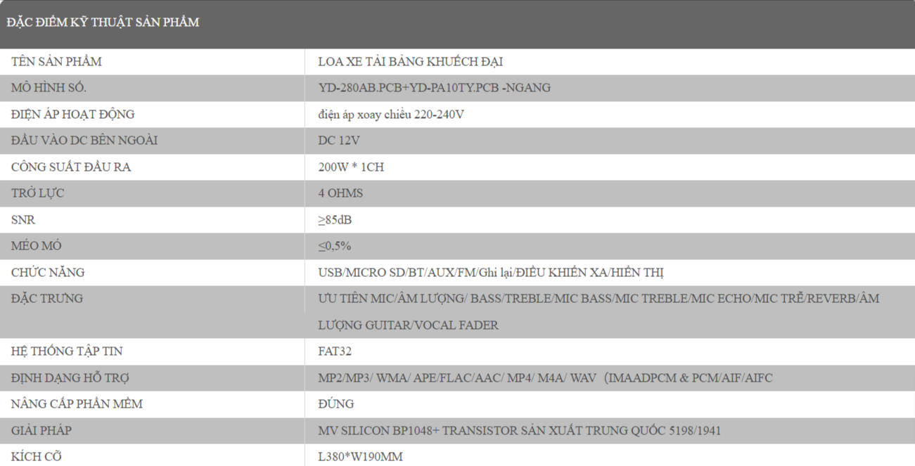 Mạch công xuất loa kéo mã : YD-280AB.PCB+YD-PA10TY.PCB được phân phối bởi Ánh Sáng Hoàng Long có đặc điểm kỹ thuật theo bảng sau: