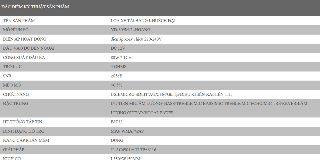 Mạch công xuất loa kéo mã : YD-809M-2 được phân phối bởi Ánh Sáng Hoàng Long có đặc điểm kỹ thuật theo bảng sau: